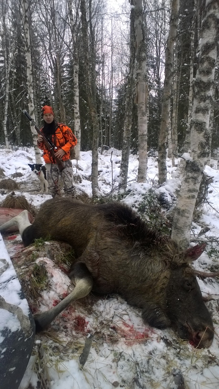 Hirvenmetsästyksen parhautta, jahtivieraalle ensimmäinen hirvenmetsästyspäivä ja saaliiksi vasa. Hyvä päivä, koska koiralle ko. hirvi oli myös ensimmäinen haukkuun kaadettu hirvi.